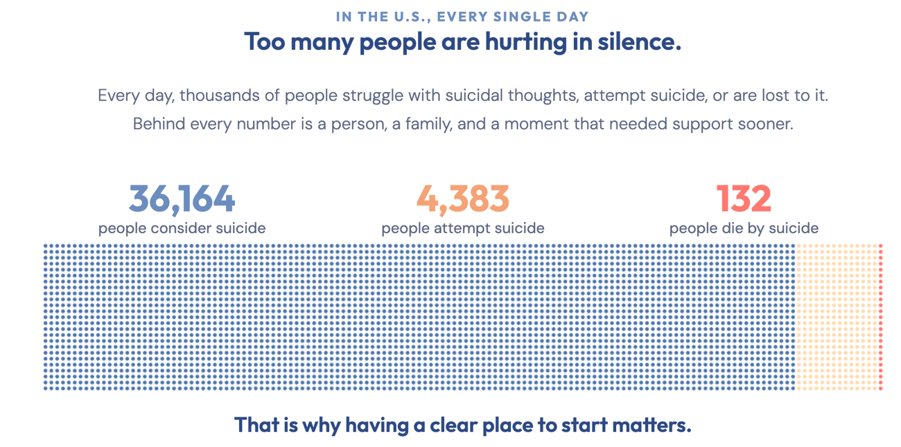 A Glimmer of Hope: 91% of U.S. adults believe suicide can be prevented. Prevention works through community support and reducing access to lethal means (which accounted for 55% of U.S. suicide deaths in 2023).