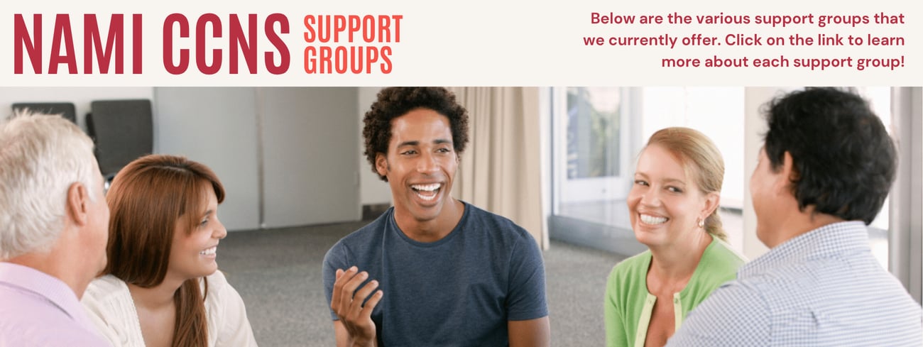 At NAMI CCNS, we believe that no one should have to navigate mental health challenges alone. We offer a variety of free, peer-led support groups designed to provide a safe, confidential space for sharing experiences and gaining strength. No registration, just walk in. You will be welcomed!